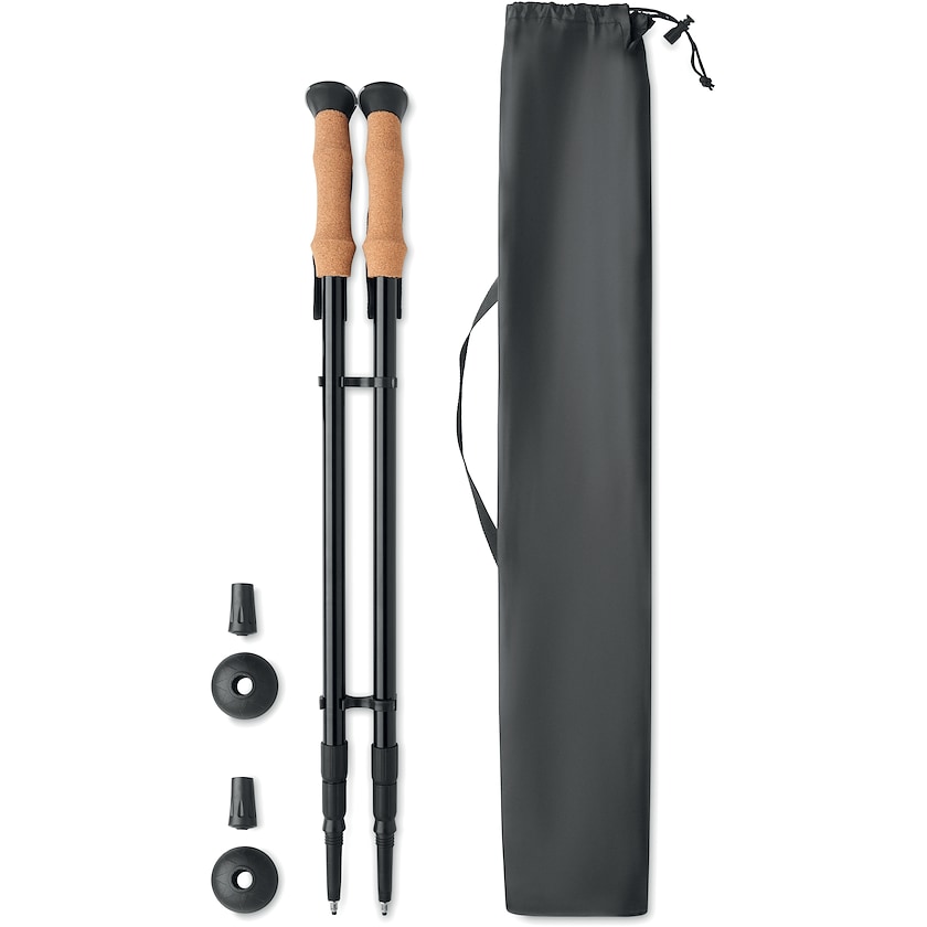 Justerbar vandrestave af bedste kvalitet. Vandrestavene er fremstillet af aluminium og har håndtag af kork. Længden kan reguleres mellem 65 og 135 cm. Leveres i et opbevaringsetui af rPET hvor trykket laves.