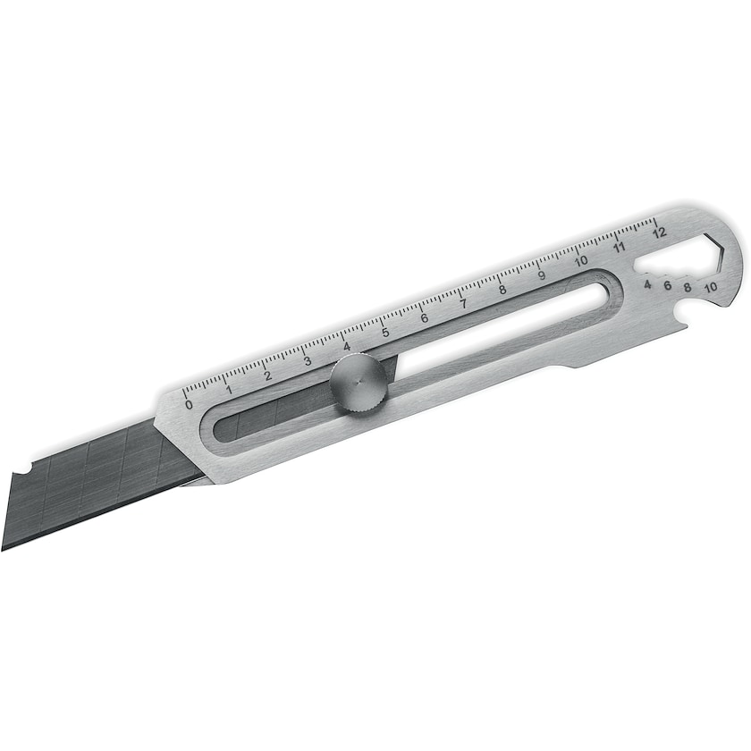 Hobbykniv i rustfri stål med kulstofstålklinge. Kniven fungerer ikke kun som kniv men også som oplukker, skruenøgle og lineal.