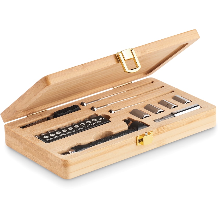 Eksklusiv værktøjskasse. Værktøjskassen indeholder det mest nødvendige for handymanden. Selve værktøjskassen er fremstillet i ægte bambus.