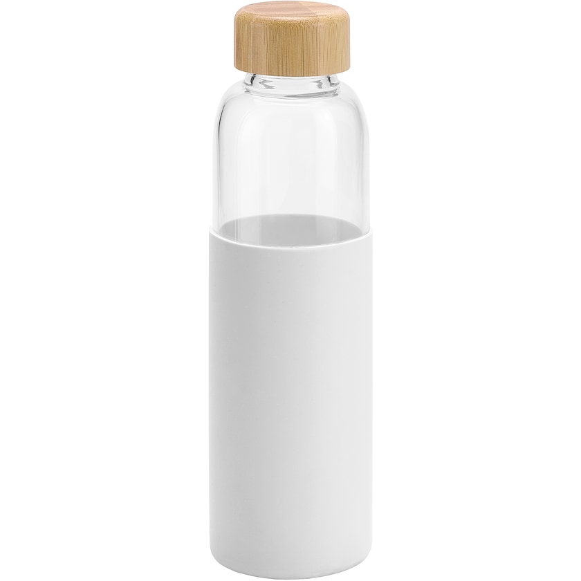 Drikkedunk af glas med silikonegreb. Låget er fremstillet af bambus. Glasset er ildfast og meget solidt. Leveres individuelt pakket i en papæske. Kun 1-farvetryk.