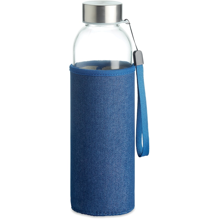 Glasflaske med neoprenhylster med denim-look. Glasflasken rummer 50 cl. Låget er i rustfri stål. Glasflasken er ikke egnet for læskedrikke.