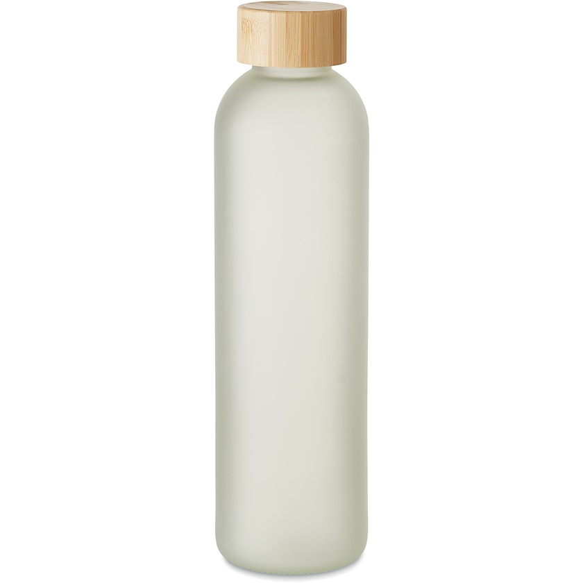 Glasflaske med logo på hele overfladen. Flasken kan rumme 65 cl. Låget er lavet af bambus. En flot glasflaske med fantastiske trykmuligheder.