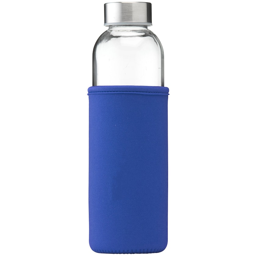 Drikkedunk med beskyttende hylster af neopren. Glastypen er soda lime glas og er holdbart. Låget er fremstillet af rustfri stål. Tag låget af og drikkedunken kan gå i opvaskemaskine. Kun 1-trykfarve er mulig.