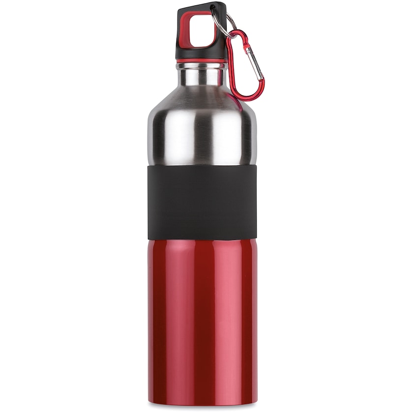 Drikkedunk lavet af rustfrit stål med gummigreb og karabinhage.