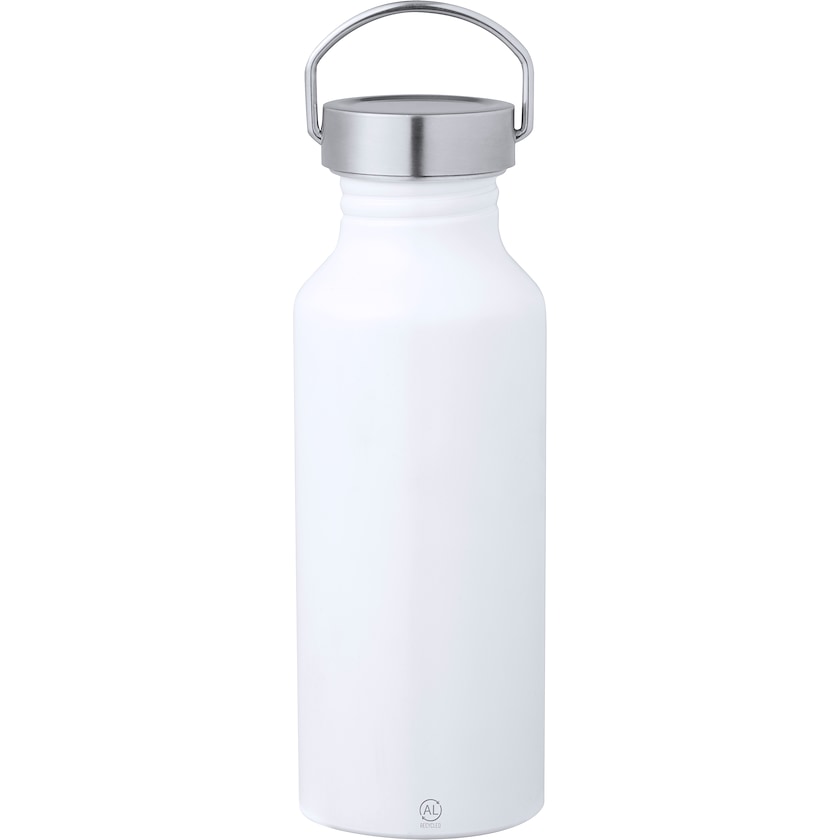 Drikkedunk af genanvendt aluminium. Låget er et smart bærehåndtag. Foran er der et mærke som viser at drikkedunket er fremstillet af genanvendt aluminium.