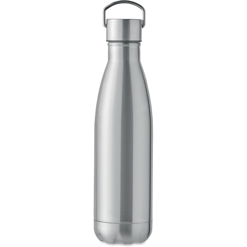 Termoflaske i genanvendt rustfri stål. Termoflasken er fremstillet af 90% genanvendt rustfri stål og 10% rustfri stål. Låget er forsynet med en hank. Lækagefri.