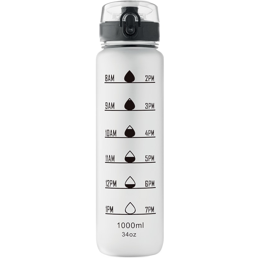 Drikkedunk af rPET med tidsmarkeringer. Låget er forsynet med sikkerhedslås og kan åbnes med en hånd. Lækagetæt.
