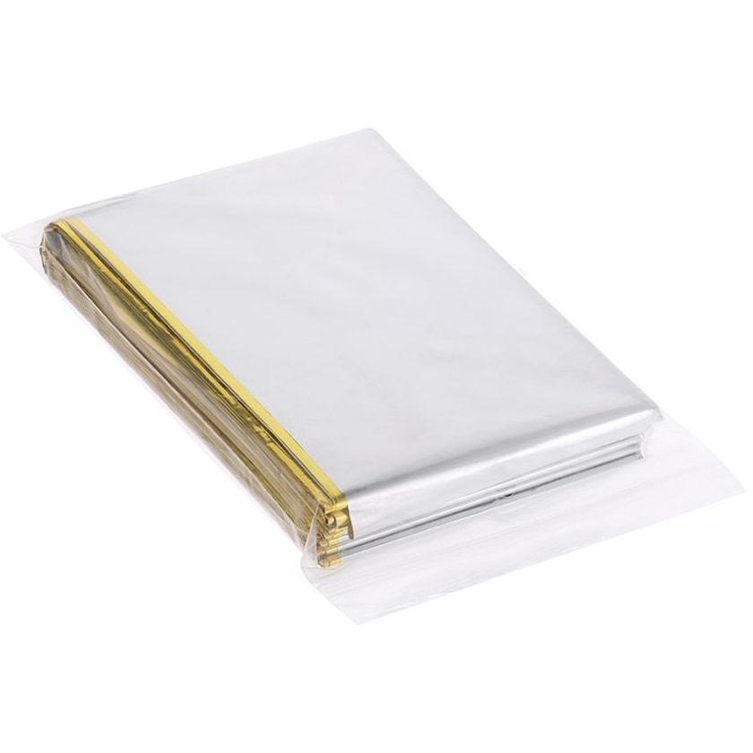 Nødtæppe i lommeformat. Reflekterer kropsvarmen hvilket gør at du både bliver varmet op og kan holde varmen. Trykket laves på et klistermærke på emballagen.