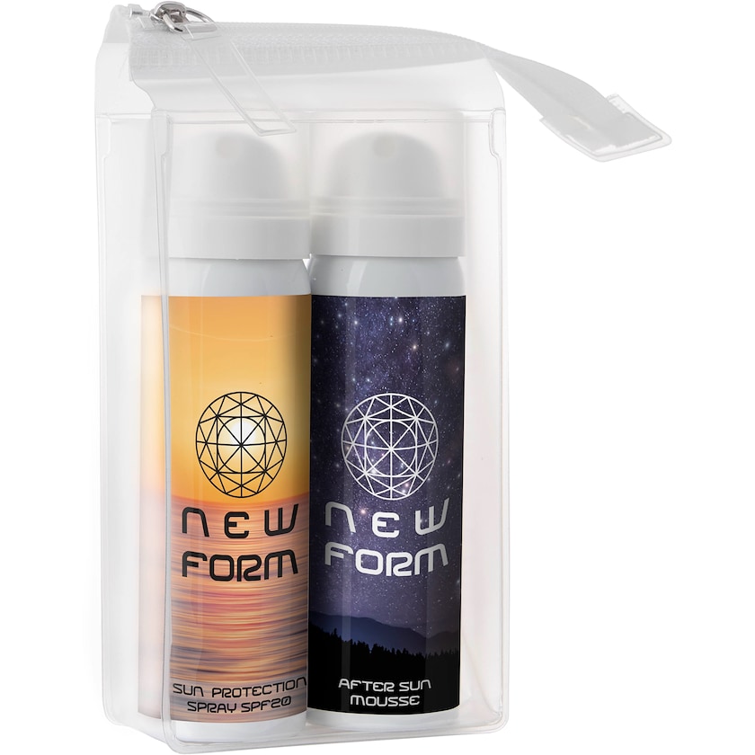 Sæt med solspray og solcreme. Hver aluminiumflaske indeholder 50 ml. Solsprayen har solfaktor SPF30. Flaskerne er miljøvenlig eftersom de drives med luft i stedet for drivgas. Trykprisen henviser til tryk på begge flasker.