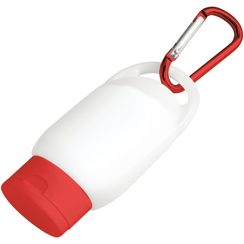 Solcreme i emballage med karabinhage. Cremen har solfaktor SPF30. På bagsiden er der information på flere forskellige sprog. Mærkning laves med et digitaltrykt klistermærke.