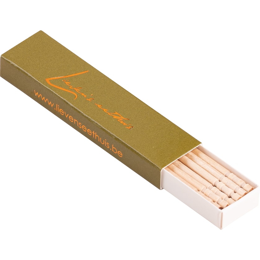 Papæske indeholdende omkring tyve tandstikker i træ. Boksen påtrykkes efter dine ønsker.