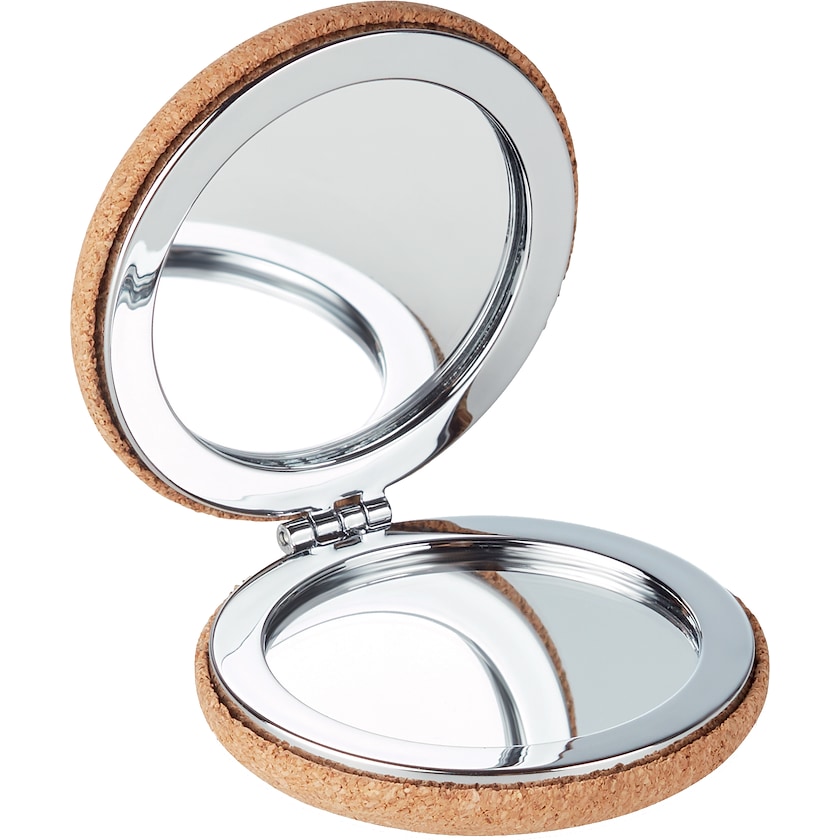 Dobbelt make-up spejl med overflade i kork. Kork er et naturligt materiale som gør at alle eksemplarer er unikke. Mærkningen kan enten laves med tryk eller lasergravering.
