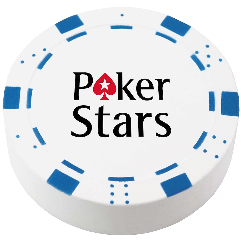 Stressbold designet som en pokerchip. Det yderste blå tryk er fortrykt på alle stressbolde. Et sjovt reklameprodukt til alle spilvirksomheder!