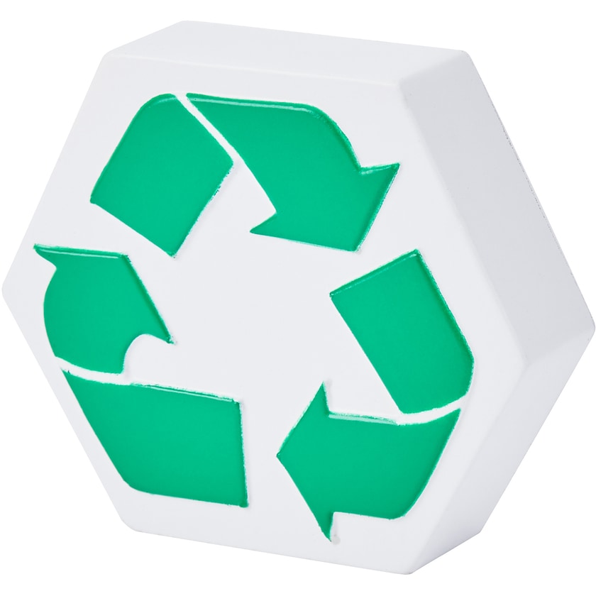 Stressbold formet som et genbrugssymbol. Axon Profils tryk på stressbolde er af den højeste kvalitet og tåler lang tids anvendelse.