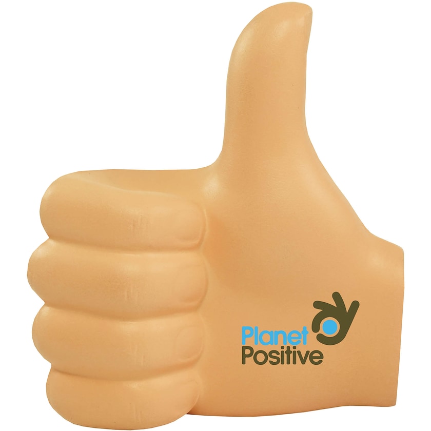 Stressbold som giver tommel op. En stressbolder der spreder positiv stemning. Trykket holder lige så længe som stressbolden.