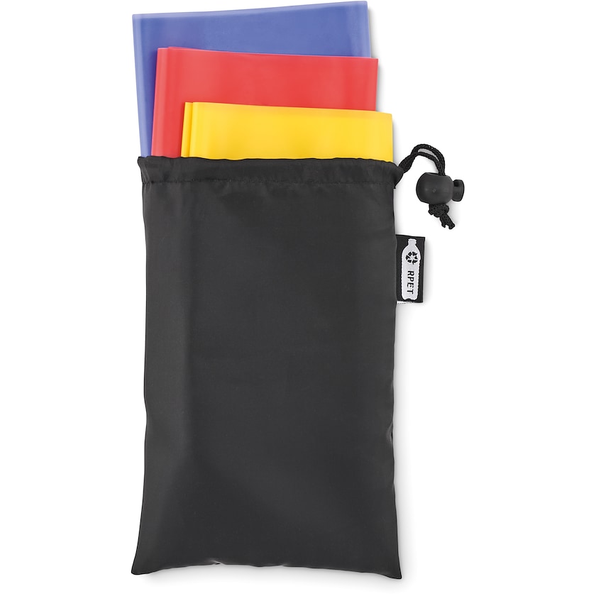 Miljøvenligt sæt med 3 stk. gummibånd i opbevaringspose. Gummibåndene er fremstillet af TPE og opbevaringsposen af miljøvenligt rPET. De tre gummibånd giver alle forskelligt modstand.