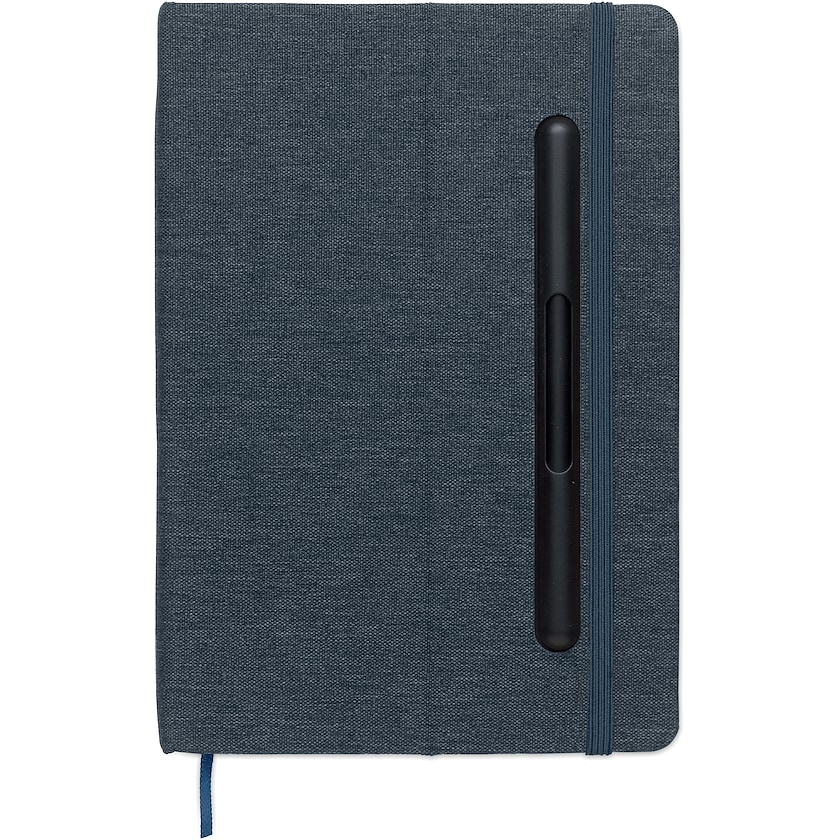 Notesbog med kuglepen samt holder til mobiltelefonen. Notesbogens hårde omslag er lavet af miljøvenligt rPET. Indlægget består af 96 linjerede sider af FSC-certificeret genbrugspapir. Kuglepennen har både blæk og blækfri skrift.