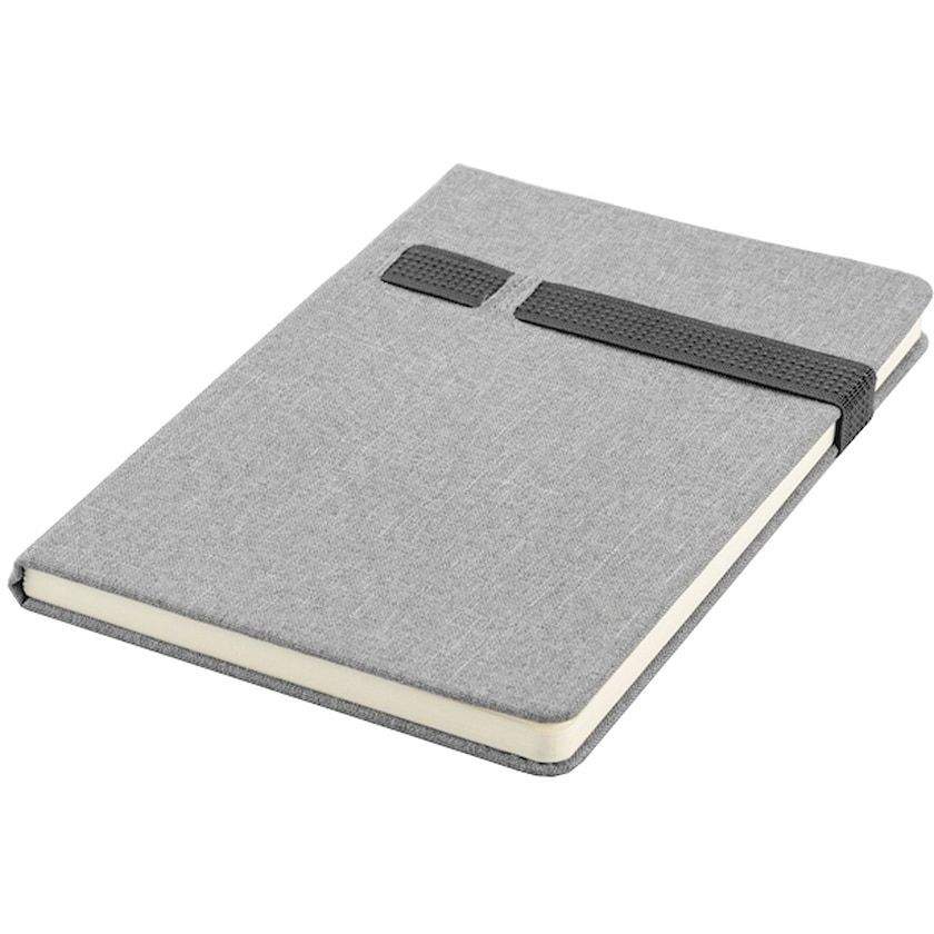 Skriveblok med elastisk bånd til f.eks. mobiltelefon og pen. Omslaget er produceret i et stofmateriale der minder om hør. Indholder 80 linjerede sider.