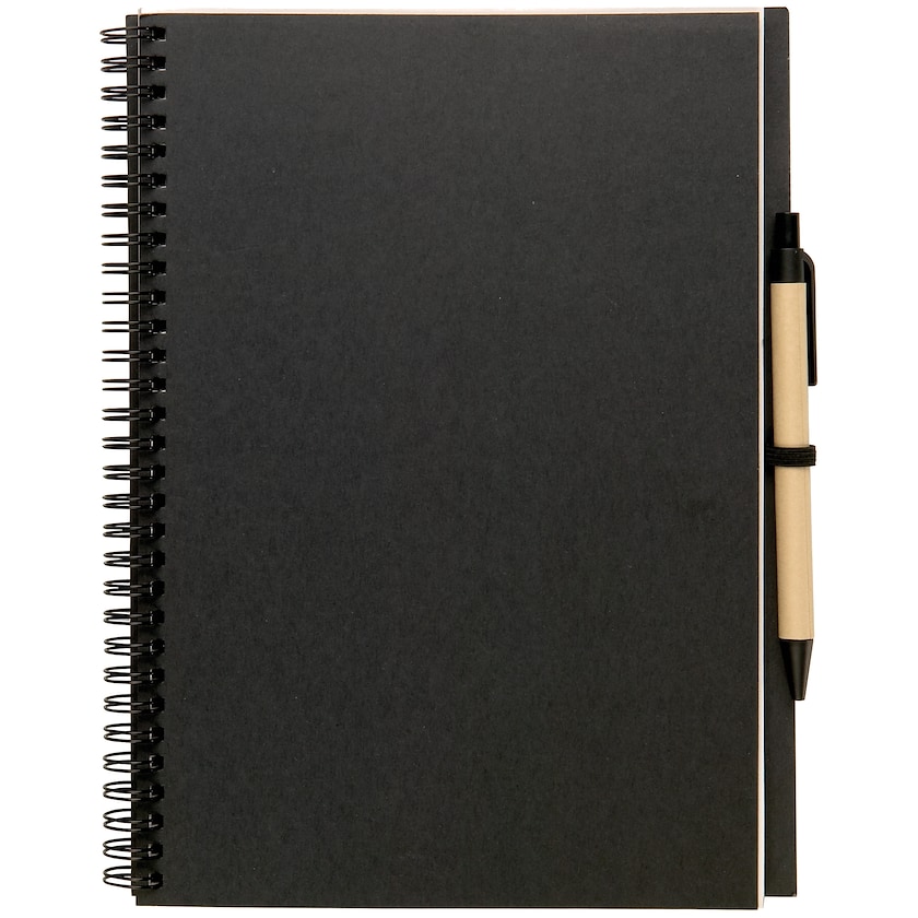 Miljøvenlig spiralblok med kuglepen. Blokken har 70 blanke sider af genanvendt papir og kuglepennen er fremstillet af genanvendt og biologisk nedbrydeligt materiale.
