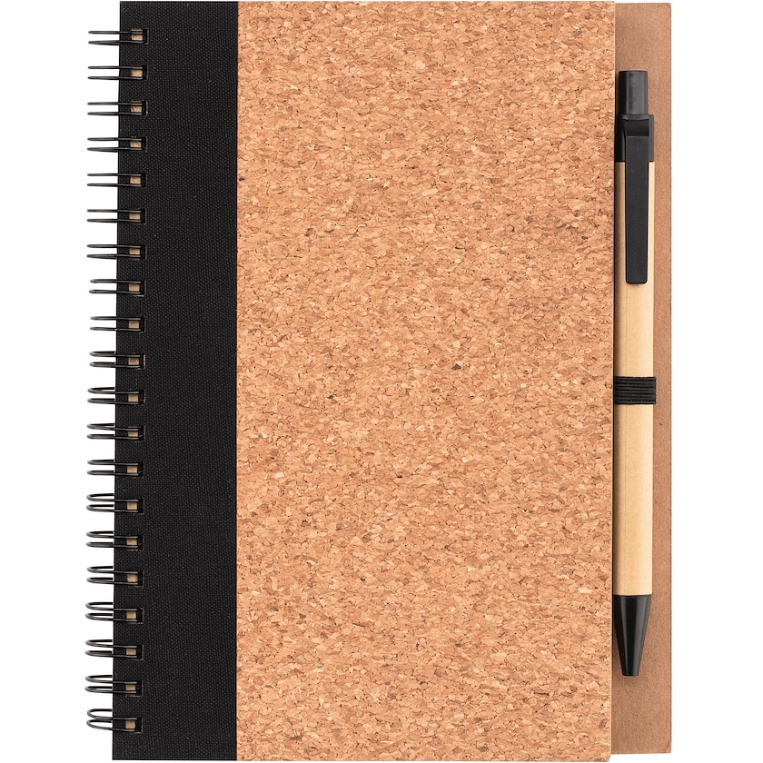 Miljøvenlig skrivebog med tilhørende kuglepen. Skrivebogens omslag er fremstillet af kork og har et indlæg af 70 linierede ark af genbrugspapir. Kuglepennen har sort blæk og er fremstillet af genbrugspap samt majsplast. Trykprisen henviser til tryk på enten skrivebogens omslag eller på kuglepennen.