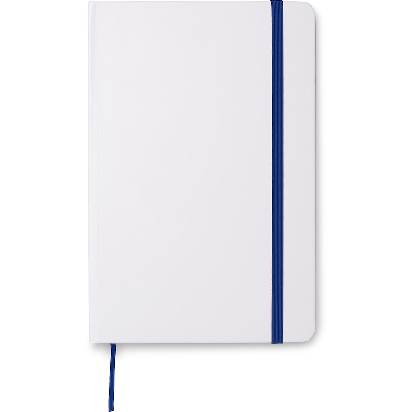 Notesbog i A5-størrelse med 100 blanke sider. Notesbogen har et hvidt omslag med farvet elastiskbånd og sider i kontrastfarve.