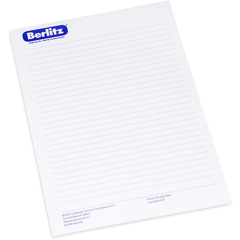 Limet notesbog i A5 størrelse med eget logo. Bagsiden er af karton. Tryk i op til fire farver laves i Pantoneskalaen og derover i CMYK. Vælg selv mellem 10, 20 eller 30 ark. Hele frontsiden trykkes efter dine ønsker.