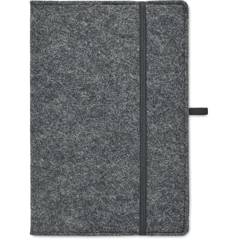 Notesbog med omslag i filt af genbrugsmateriale. Indlæg består af 80 linjerede ark i genbrugspapir. Omslaget er fremstillet af rPET, dvs. genbrugs PET-flasker.