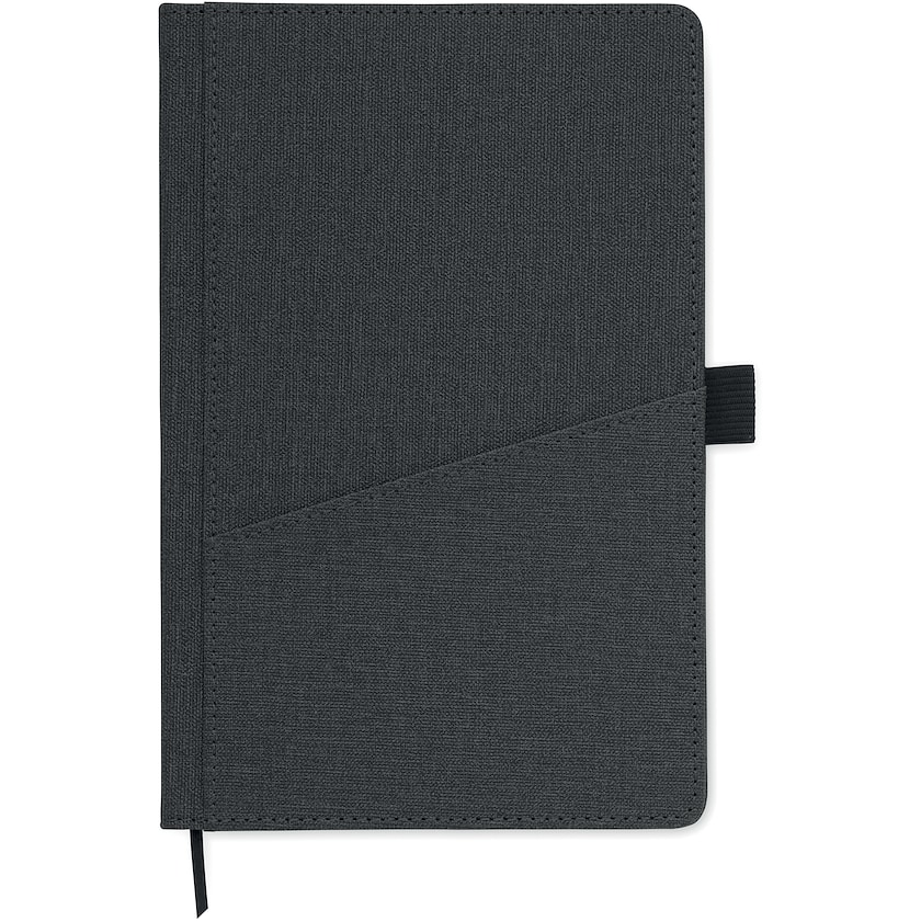 Notesbog med lomme til mobiltelefonen på forsiden. Indlæg består af 80 linjerede ark af genbrugspapir.