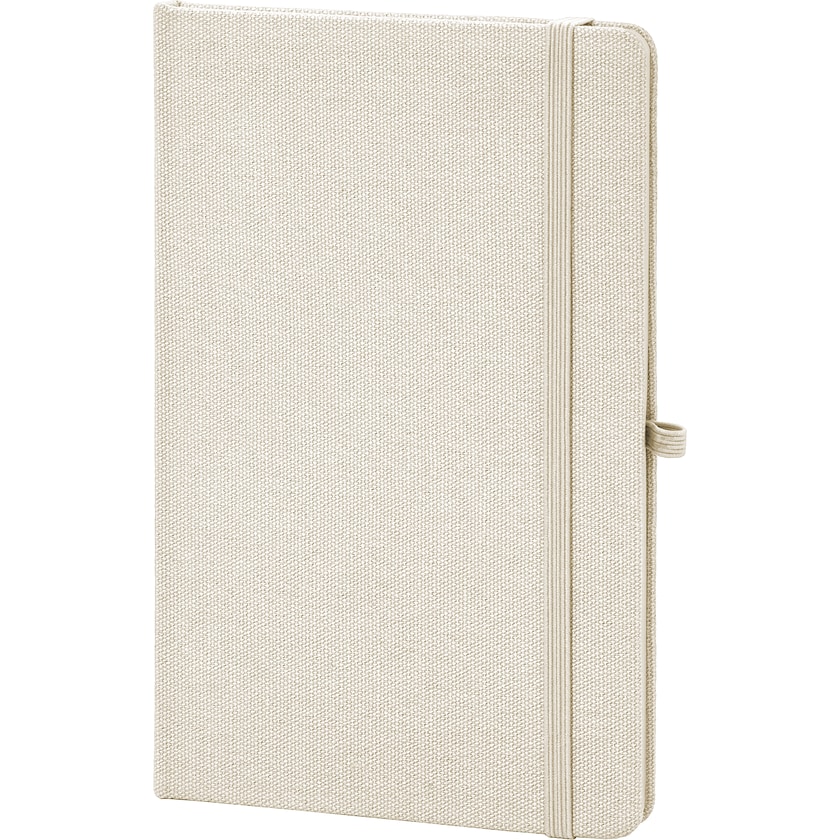 Notesbog i A5-format af genbrugsmateriale. Omslaget er fremstillet af genbrugsbomuld og indlæg består af 80 linjerede ark af genbrugspapir. Notesbogen er forsynes med elastisk bånd, bogmærke og kuglepensholder.