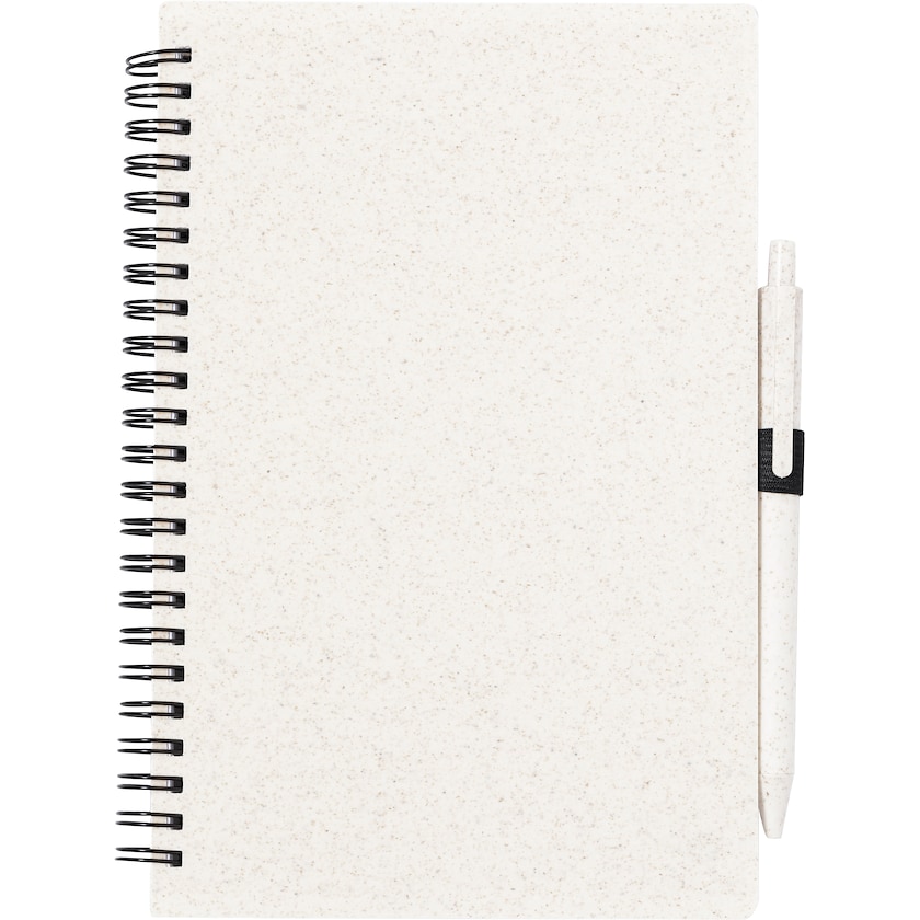 Miljøvenlig spiral notesbog inklusiv kuglepen. Omslaget er fremstillet af økologisk hvedehalm og indlæg består af 80 linjerede ark af genbrugspapir. Kuglepennen er også fremstillet af hvedehalm.