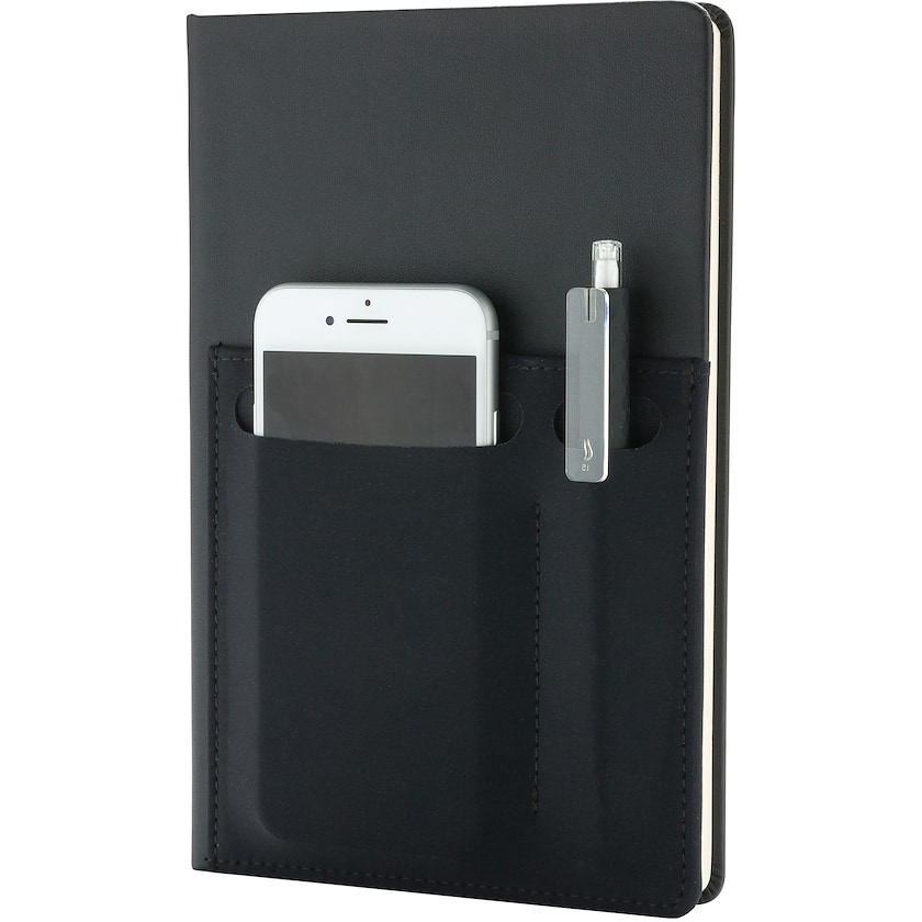 Blok i A5-størrelse med smarte lommer på forsiden. Forsiden består af lommer til kuglepen, dokumenter og en fleksibel telefonlomme på 8 cm, hvilket gør at den passer til en iPhone 7 Plus. Blokken består af 80 linjerede sider i cremefarver.