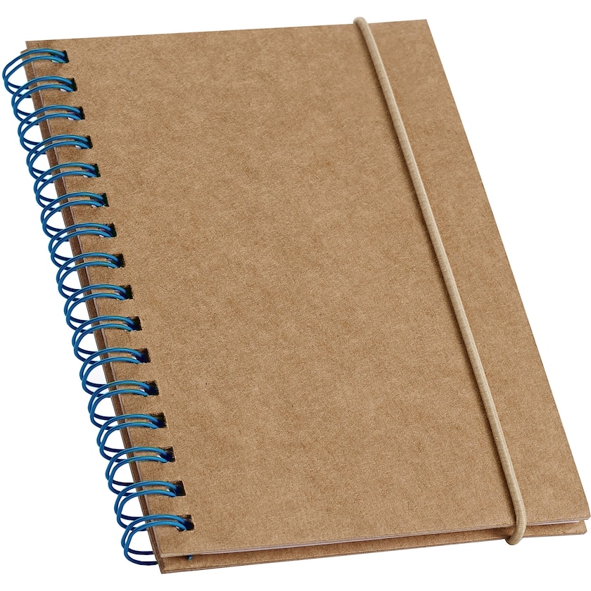 Notesbog med farvet spiral samt naturfarvet papomslag. Notesbogen har 60 linjerede sider af genbrugspapir.
