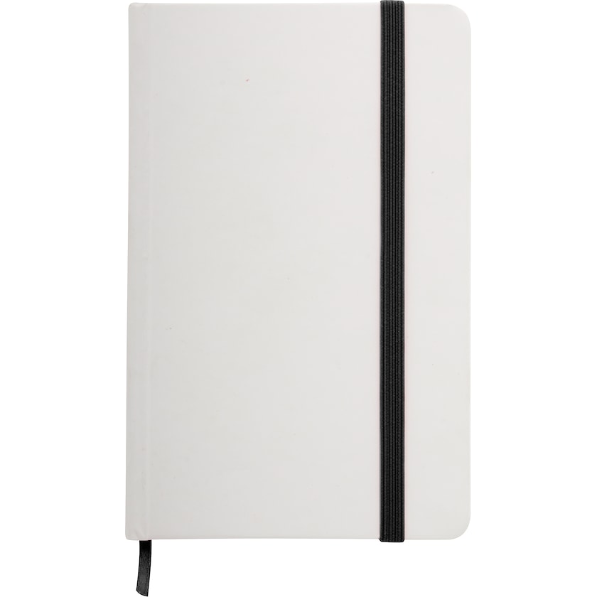 Hvidt skriveblok med karton omslag og med gummibånd i kontrastfarve. Båndet er både en pæn designdetalje og et praktisk hjælpmiddel til let at finde vigtige notater. Blokket har 80 ufarvede ark.