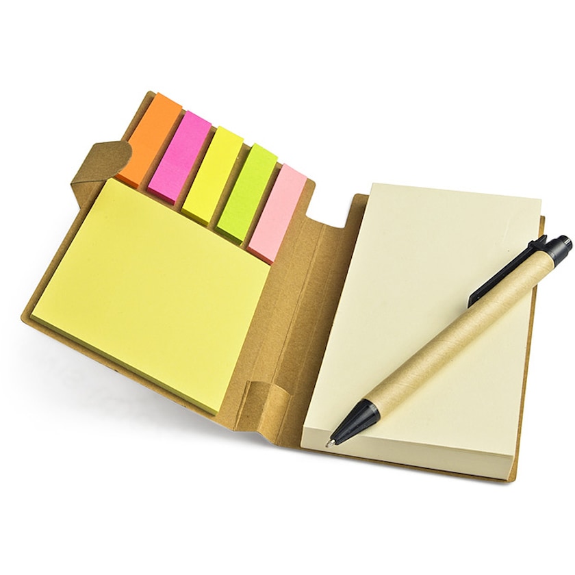 Notesbøger med kuglepen, faneblade og selvklæbende notesblok. Kuglepennen er fremstillet af genbrugsplastik og papir. Selve blokken er ligeledes fremstillet af genbrugspapir. Bestil miljøvenlige notesbøger med kuglepen hos Axon Profil!
