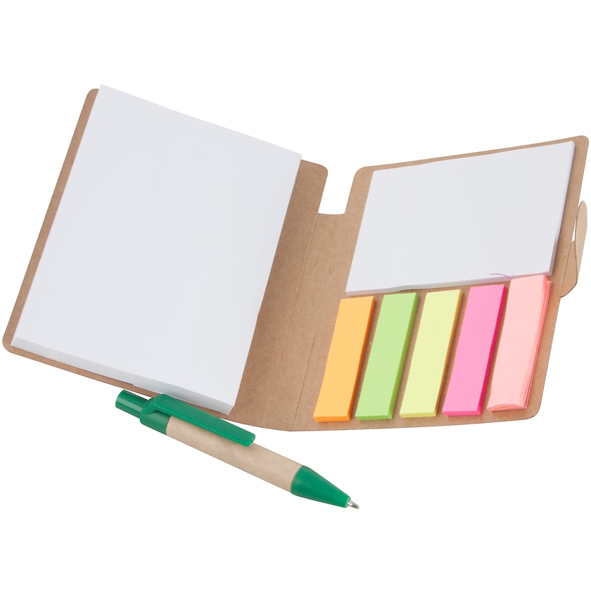 Indeksfaner kombineret med skriveblok og kuglepen. Både notesbog og kuglepen er fremstillet i genanvendelige materialer. Mærkning kan kun ske på selve blokken. Bestil notesbog med indeksfaner hos Axon Profil!