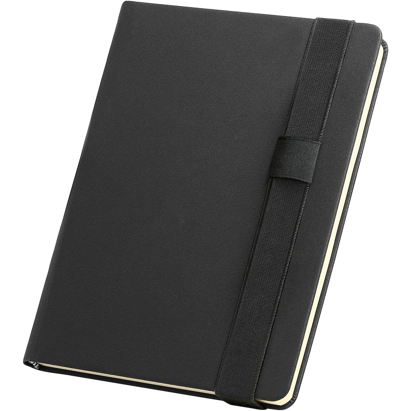 Notesbog i A5 størrelse med hårdt omslag i kunstlæder. Notesbogen har en praktisk holder til en kuglepen og i 140 cremefarvede sider. Kuglepen indgår ikke.