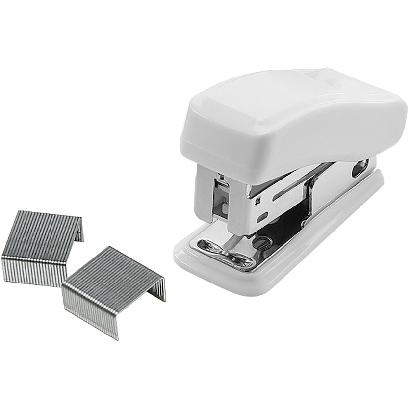Klipsemaskine i miniformat. Leveres med clips af typen 26/6. Tryk laves med maksimalt to farver.