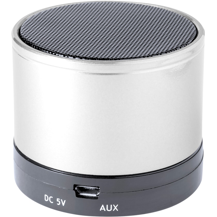 Rund bluetooth-højtalere i metal. Har flere funktioner som radio, mp3-afspiller og højtalertelefon. Mærkning sker ved lasergravering.