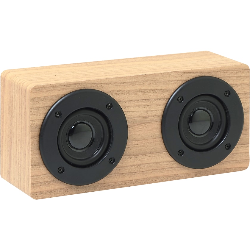 Bluetooth-højtaler med dobbelte højtalere og indbygget forstærkere. Højtalerens yderside er lavet i træ. Mærkning sker enten ved tryk eller lasergravering på træet.