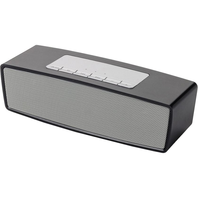 Flot bluetooth-højtaler i elegant design. Højtaleren kan tilsluttes på flere forskellige måder. Foruden tilslutning via bluetooth kan tilslutning ske via AUX, mikroSD-kort og USB-stik. Højtaleren har endda en indbygget radio og kan anvendes som speaker phone. Produktet er CE-mærket. Tryk sker med digitaltryk på højtalergitteret