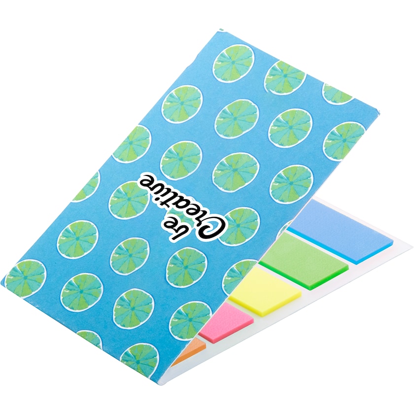 Indeksfaner i fem forskellige farver med omslag af papir. Der er i alt 100 indeksfaner, og de måler 44 x 12 mm. Ydersiden af omslaget er digitaltrykt.