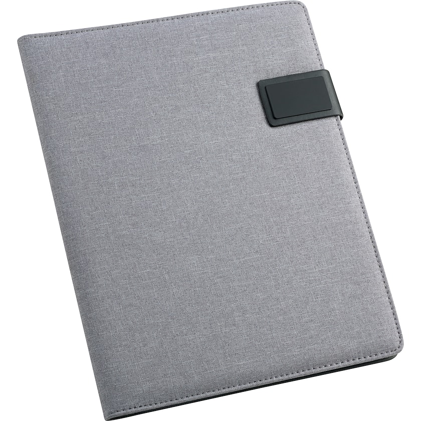 Konferencemappe i A4-størrelse med omslag beklædt i stof og kunstlæder. Mappen lukkes med en magnet. I mappen findes 20 linjerede sider. På forsiden findes en metalplads som kan lasergraveres. Kuglepen indgår ej.