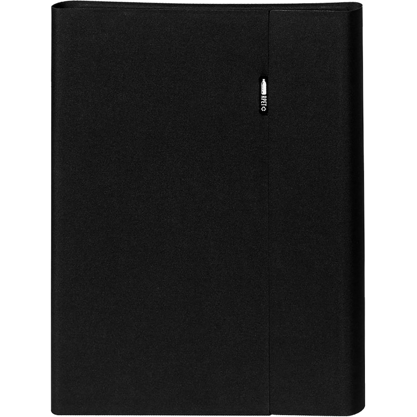 Elegant konferencemappe i genbrugsmateriale. Konferencemappen er fremstillet af rPET (dvs. genbrugs PET-flasker). Indvendigt er der en notesbog med 20 linjerede ark. Mappen holdes lukket med magnetlås.