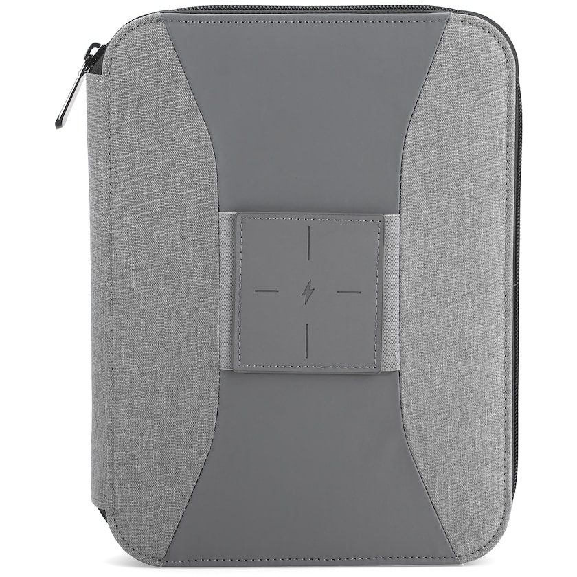 Konferencemappe med indbygget 5000 mAh powerbank. Indvendigt er en notesblok, visitkortlommer samt plads til en kuglepen. Opladning kan enten ske trådløst ved at placere mobiltelefonen på mappens forside, eller via kabel.
