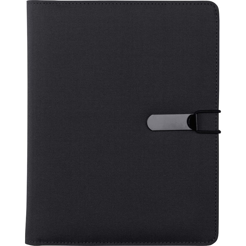 Konferencemappe i A5-format i miljøvenligt rPET. Indvendigt er der en skriveblok med 64 linjerede ark af FSC-certificeret papir. Mærkning laves enten med 1-trykfarve eller lasergravering.