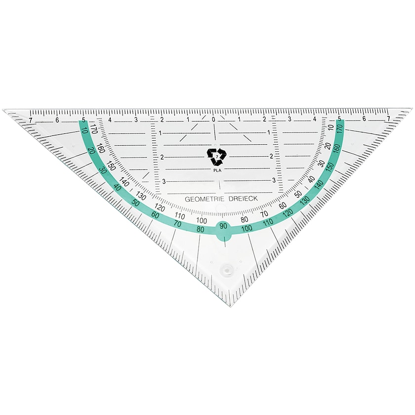 Miljøvenlig triangulær lineal. Linealen er fremstillet af bioplast og har en 14 cm skala samt en farvet skala for måling af vinkler.