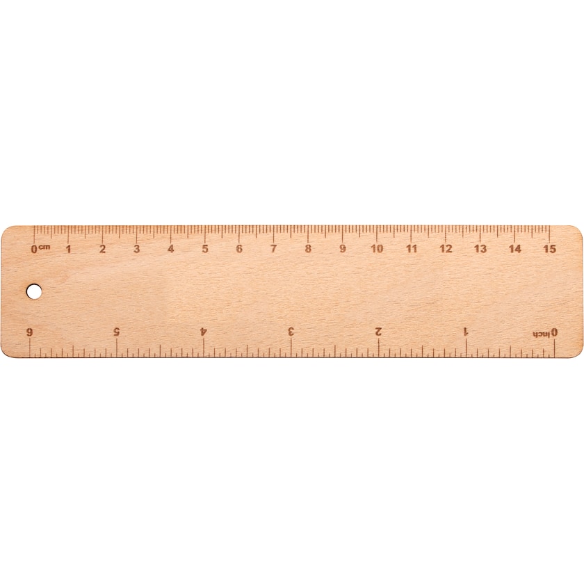 15 cm trælineal der er fremstillet i Europa. Mærkningen laves enten ved tryk eller lasergravering.