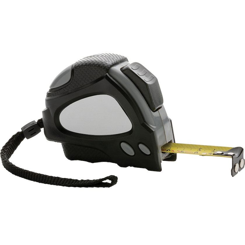Robust målebånd af RCS-certificeret genbrugs ABS. Målebåndet har en bredde på 19 mm. Leveres individuelt pakket i emballage af FSC-certificeret papir. Trykket placeres under en beskyttende overflade af transparent epoxy.