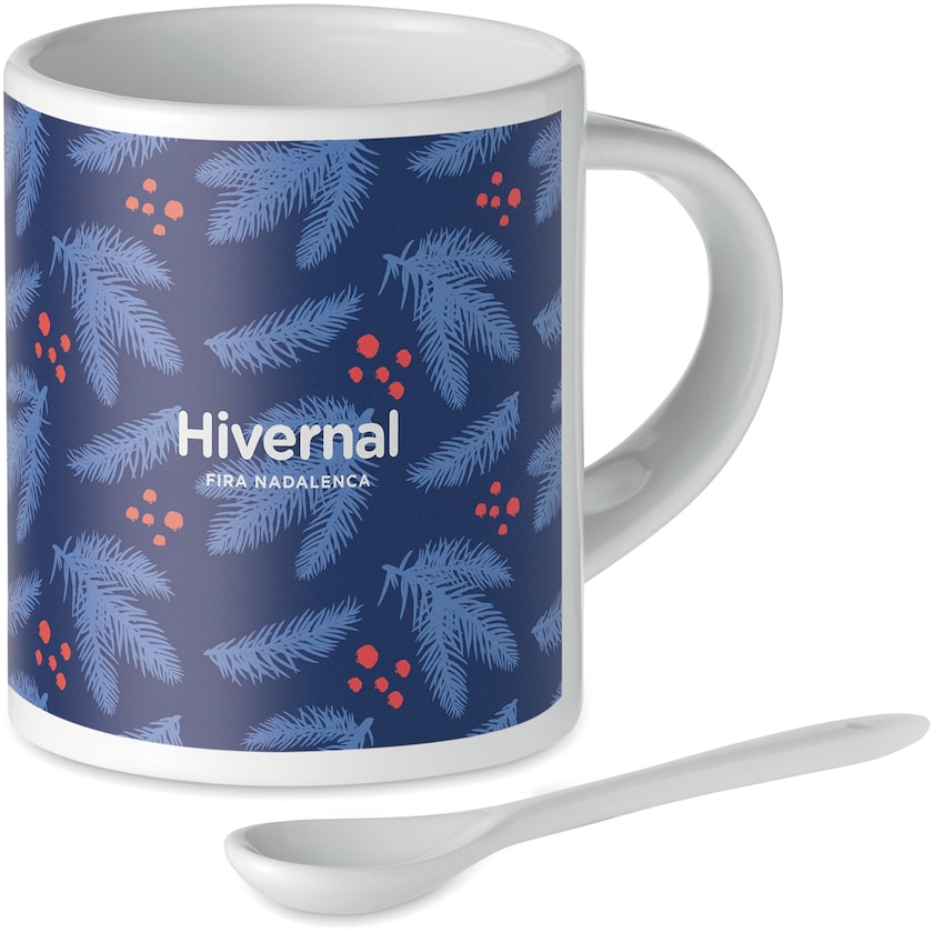 Fotokrus med ske. Kruset har stor trykflade hvilket giver dig gode muligheder for at levere et stærkt reklamebudskab. Skeen opbevares i krusets hank når den ikke er i brug.