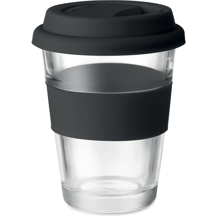 Glaskrus med låg og greb af silikone. Kruset rummer 35 cl.
